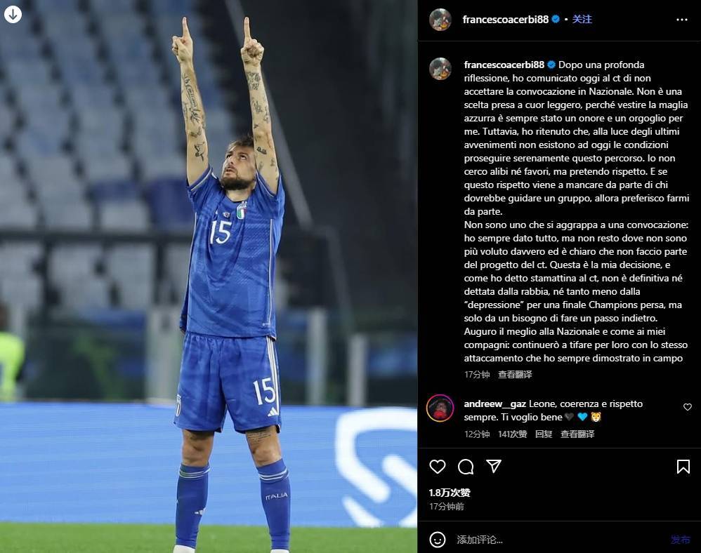 直播吧06月01日讯 意大利主帅斯帕莱蒂接受采访透露,阿切尔比拒绝了本期意大利国家队的征召。阿切尔比刚刚在社媒做出回应。