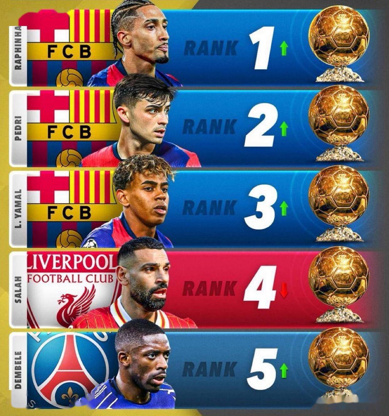 金球奖最新排名:拉菲尼亚(巴塞罗那)第1且上升;佩德里(巴塞罗那)第2且上升;亚马尔(巴塞罗那)第3且上升;萨拉赫(利物浦)第4且下降;登贝莱(巴黎圣日耳曼)第5且上升 。西甲豪门皇家马德里维尼休斯和姆巴佩的排名已经不知道是多少,皇马球员在联赛和欧冠的表现都不如人意,掉出前五排名也是清理之中。目前这五位球员凭借在俱乐部赛事中的表现、对球队的贡献等因素影响排名变动。