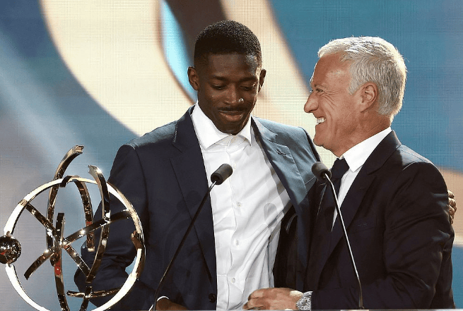 颁奖现场上演趣味互动——主持人调侃:“德尚教练听到你的位置需求了吗?”台下观礼的法国队主帅德尚接梗回应:“收到!我会让他在国家队踢左边。”